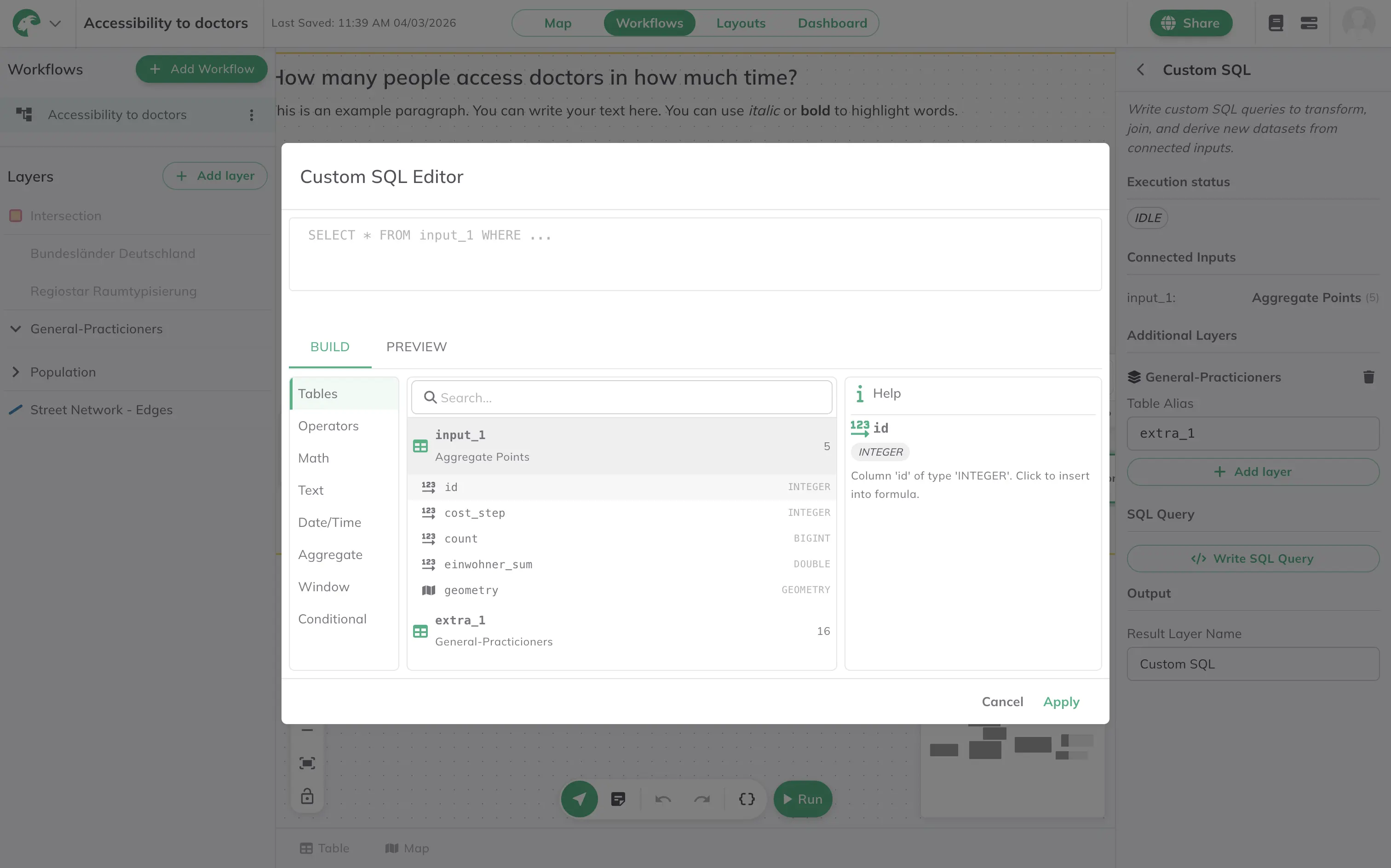 GOAT now includes a powerful Custom SQL tool with an integrated CodeMirror editor. Custom SQL can be used both as a standalone analysis tool and inside Workflows, enabling advanced geospatial data transformations directly within GOAT.