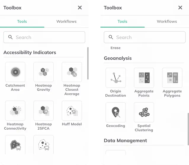 The Toolbox now includes: A search bar for faster tool discovery and a tabbed interface separating Tools and Workflows This improves usability as the number of analytical features continues to grow.