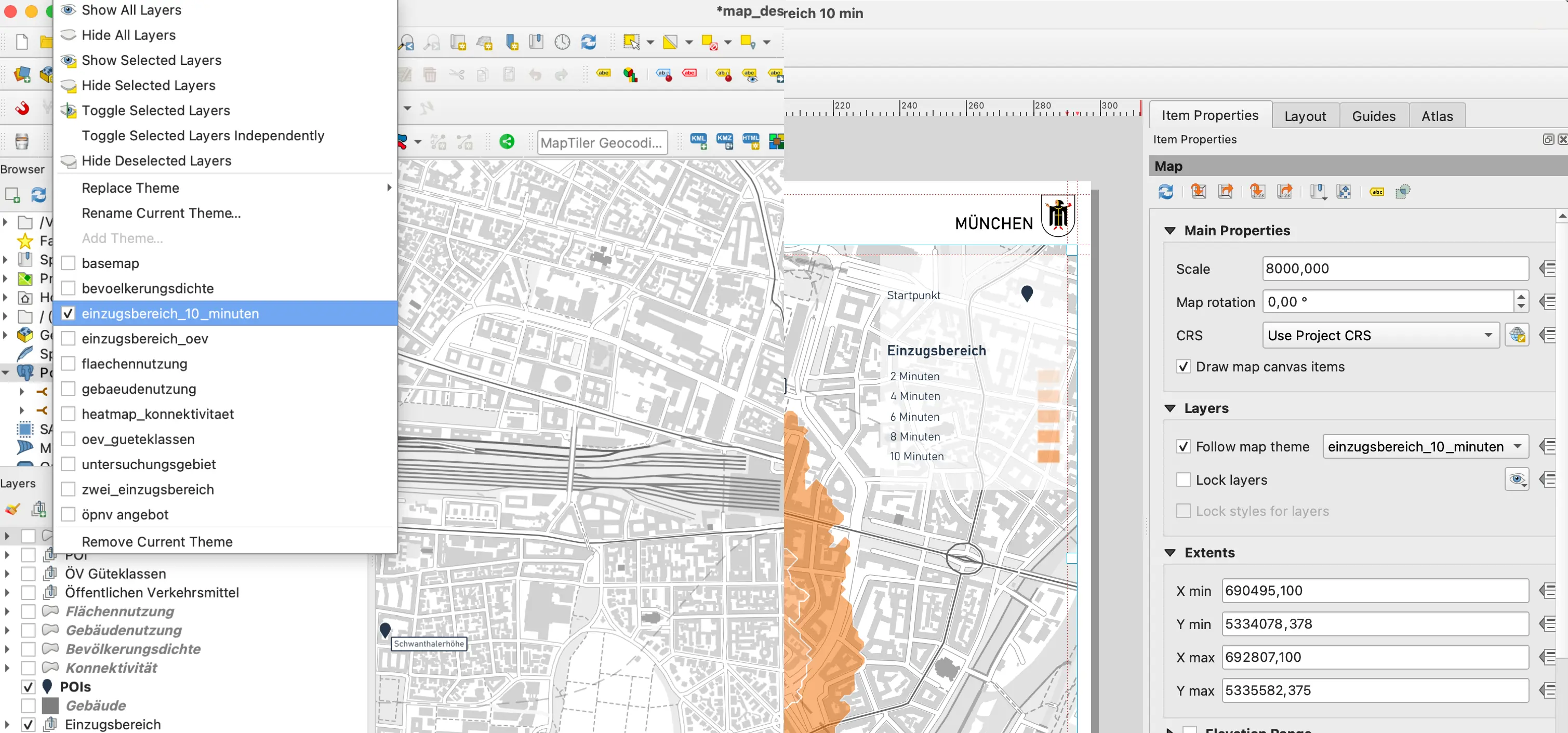Finally, QGIS becomes our canvas for designing clear, informative maps that communicate our findings effectively. We recognized that maintaining a consistent visual identity across projects was a challenge, especially when working as a team. Our solution was to build two custom plugins that automate and standardize this final phase. The first, a style application plugin, lets a user apply a predefined visual preset to any layer in just three clicks—selecting the layer, choosing the style, and applying it. This ensures that every project adheres to our design standards effortlessly. The second, a layout template plugin, allows us to generate entire map compositions with a single click. Selecting a template (e.g., "catchment area analysis") instantly adds a print layout to QGIS, complete with predefined map extents, a standardized legend, an automated scalebar, and title blocks.